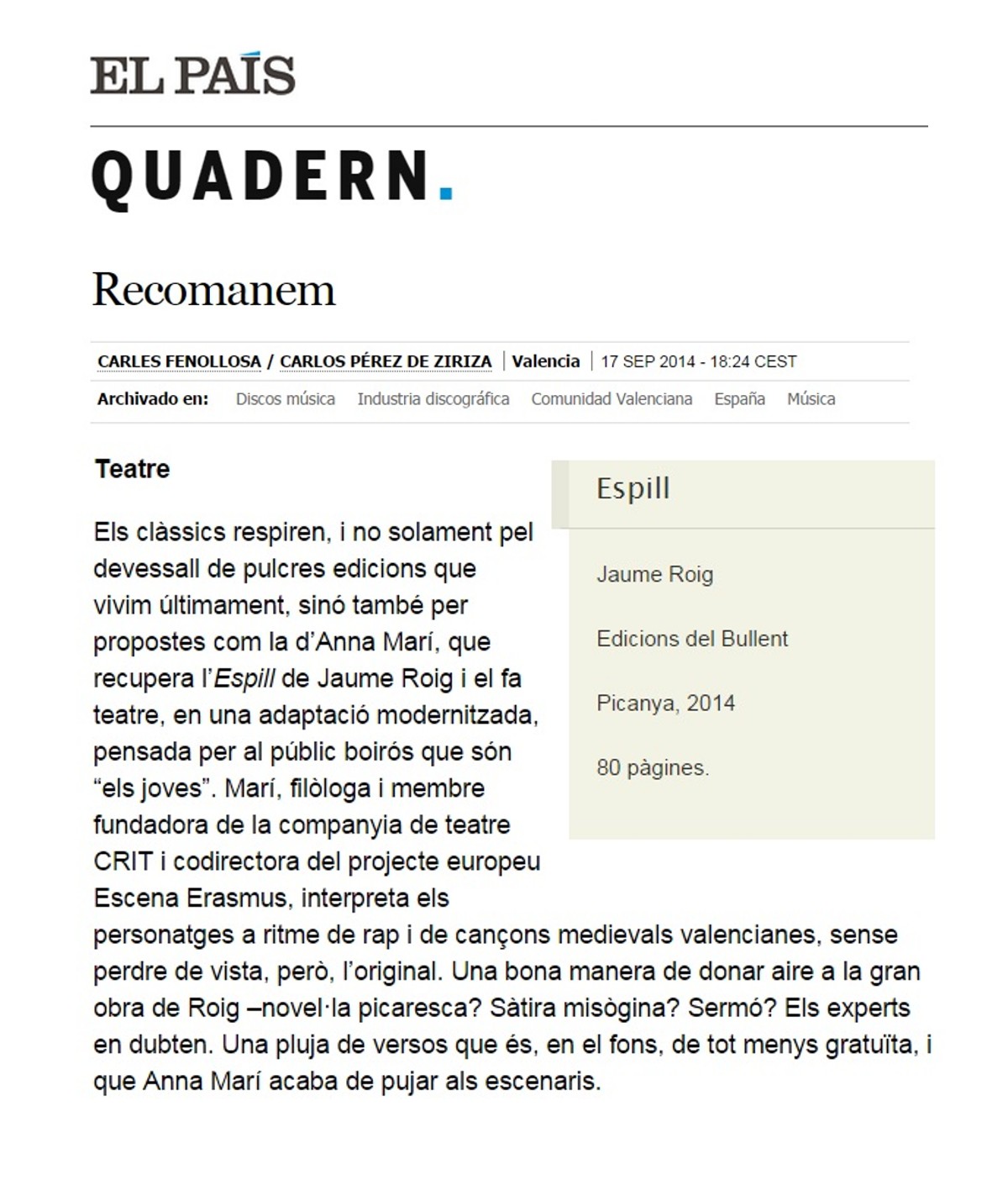 “El que sí que és nou és el rigor, la professionalitat i la capacitat de connectar amb el públic que tenen les propostes de CRIT” (Josep Lluís Sirera, catedràtic de teatre a la Universitat de València – Revista Saó, abril 2009) “Un espectáculo muy inteligentemente concebido, ameno, divertido, de lenguaje riquísimo, y que llena un hueco en el patrimonio cultural y literario”(Inma Garín, Cartellera Turia, 09/03/18) “El montaje se hace ameno, los actores demuestran su polivalencia y el Espejo, o el Libro de las mujeres, como también se le conoce, da para conversaciones posteriores en las que se recrudecen o se cierran batallas de género. Una muestra más de que los clásicos tienen algo que decirnos, incluso ahora y en temas que levantan ampollas, con razón, claro, porque la tragedia está fuera del escenario.” (Francisco J. Otero, Masescena, 22/07/2020)