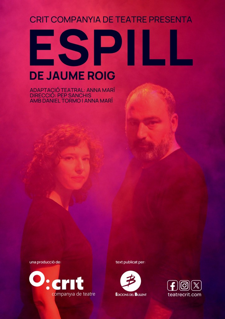 La novela en verso Espill, de Jaume Roig, es una de las obras más importantes de la literatura medieval en catalán. Nuestra adaptación teatral, a partir del original, ha dotado de voz y cuerpo a los diferentes personajes que forman parte del universo del narrador. Un espectáculo fresco, divertido y atrevido que nos aproxima a una de las novelas más brillantes y alocadas de la literatura valenciana y que pone sobre la mesa los conflictos de género desde la Edad Media hasta nuestros días.