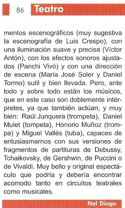 Muy bello y original espectáculo que podría y debería encontrar acomodo tanto en circuitos teatrales como musicales (Nel Diago, Cartellera Túria)
